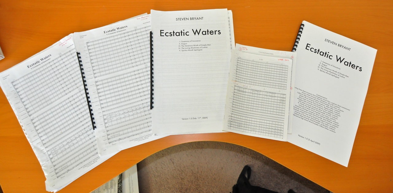 We’re moving (new house, still in Durham!), and while cleaning out my studio, I found the original scores for the Bowling Green premiere, the three UT Austin performances (including at the Meyerson and at CBDNA), and the one we used for the WASBE 2009 performance by the University of North Texas. I also found a pristine copy of version 1.0 from April 3rd, 2009 (which is actually later than the other copies, but no longer current or available – the current version is 1.2). I’ve decided to auction them off as a special “collector’s edition” set, complete with all my original markings, changes, etc. The collection is 5 scores in total. I’ll autograph one (or all) of them if you wish.